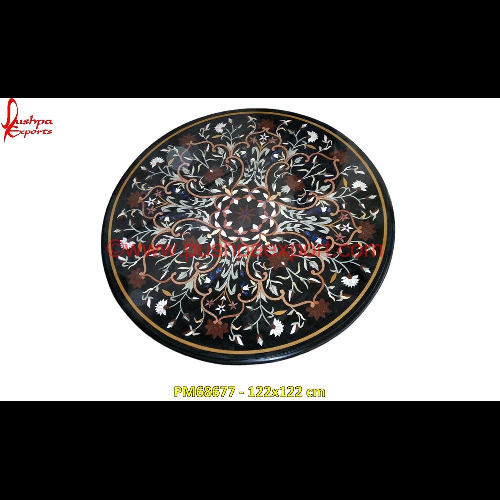 • On the carved Motif Inlay Round Black Marble Tea Table Top, one can have inlaid mother-of-pearl or semiprecious stonework.