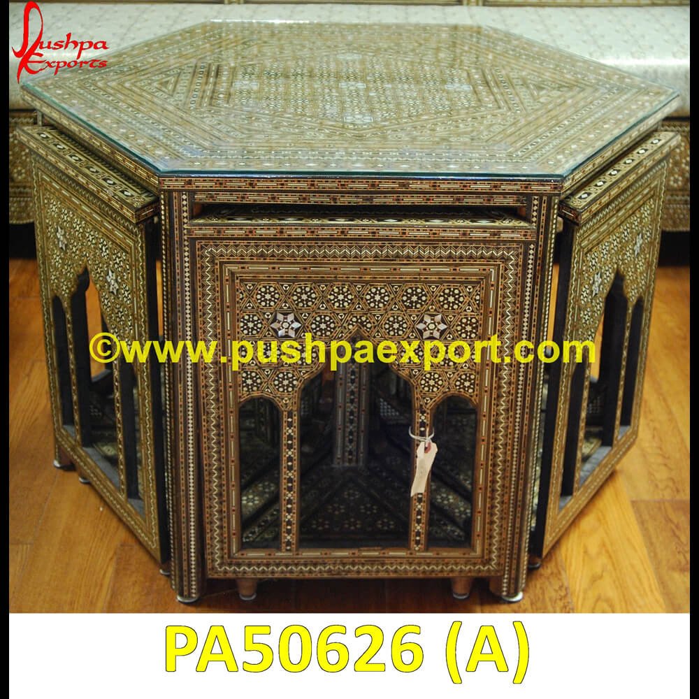 • A MOP Inlay Hexagonal Table is made by sticking mop into a sturdy, elegant, and high-quality hardwood, metal or marble structure or furniture.