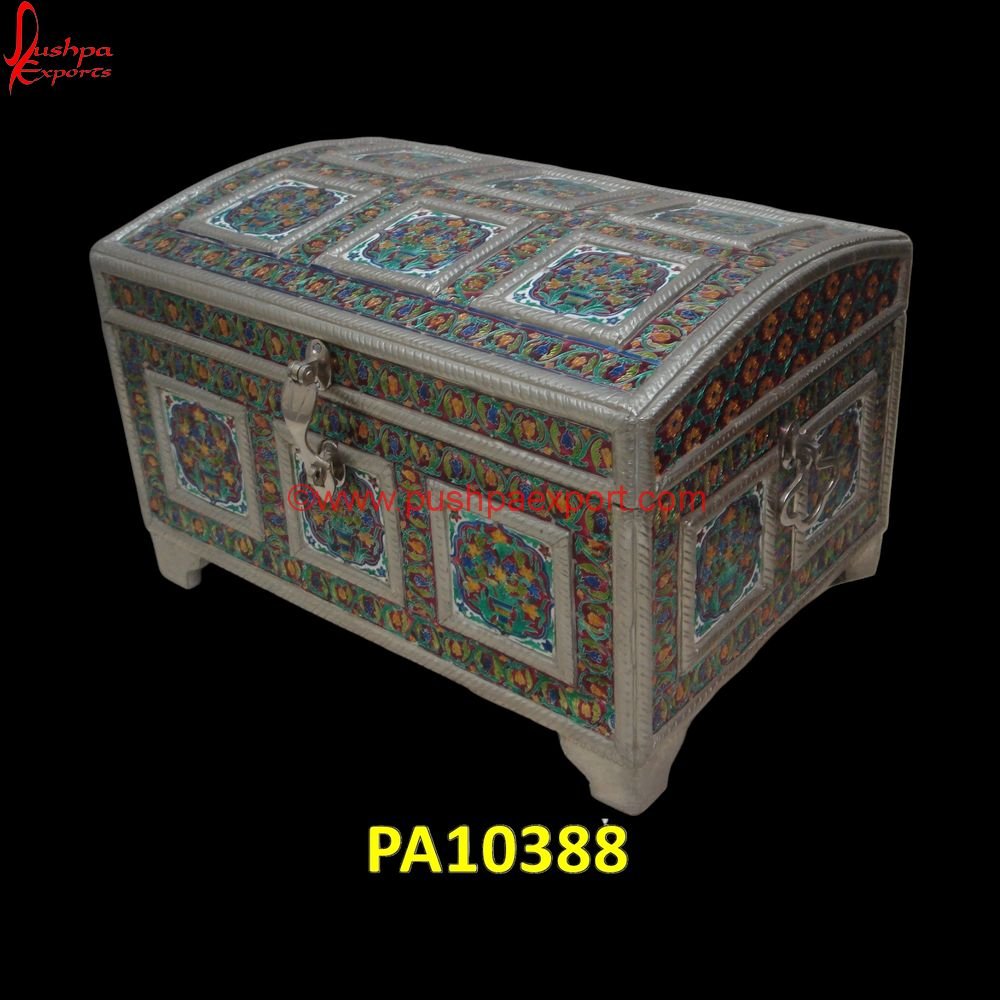 The White Metal Minakari Treasury Box is made of premium-quality Teak wood. The wooden frame of the White Metal Minakari Treasury Box is plated with an alloy of nickel, zinc, and copper. The White Metal Minakari Treasury Box will make your room look exclusive. Though it has been coated with PU/lacquer to make its shine last for years, if need be, the White Metal Minakari Treasury Box can be polished. German silver or white metal does not tarnish. The White Metal Minakari Treasury Box is fully hand-carved from start to finish. Therefore, each piece possesses some uniqueness. Anything from the size to the design of the White Metal Minakari Treasury Box is customizable. The raw materials of the White Metal Minakari Treasury Box can be altered as per the customers’ requirements. The White Metal Minakari Treasury Box can also be plated with silver, brass, bronze, or copper sheet, or it can simply be polished according to the customers’ choice. Our White Metal Minakari Treasury Box can be used in temples, homes, offices, and many other places as well.