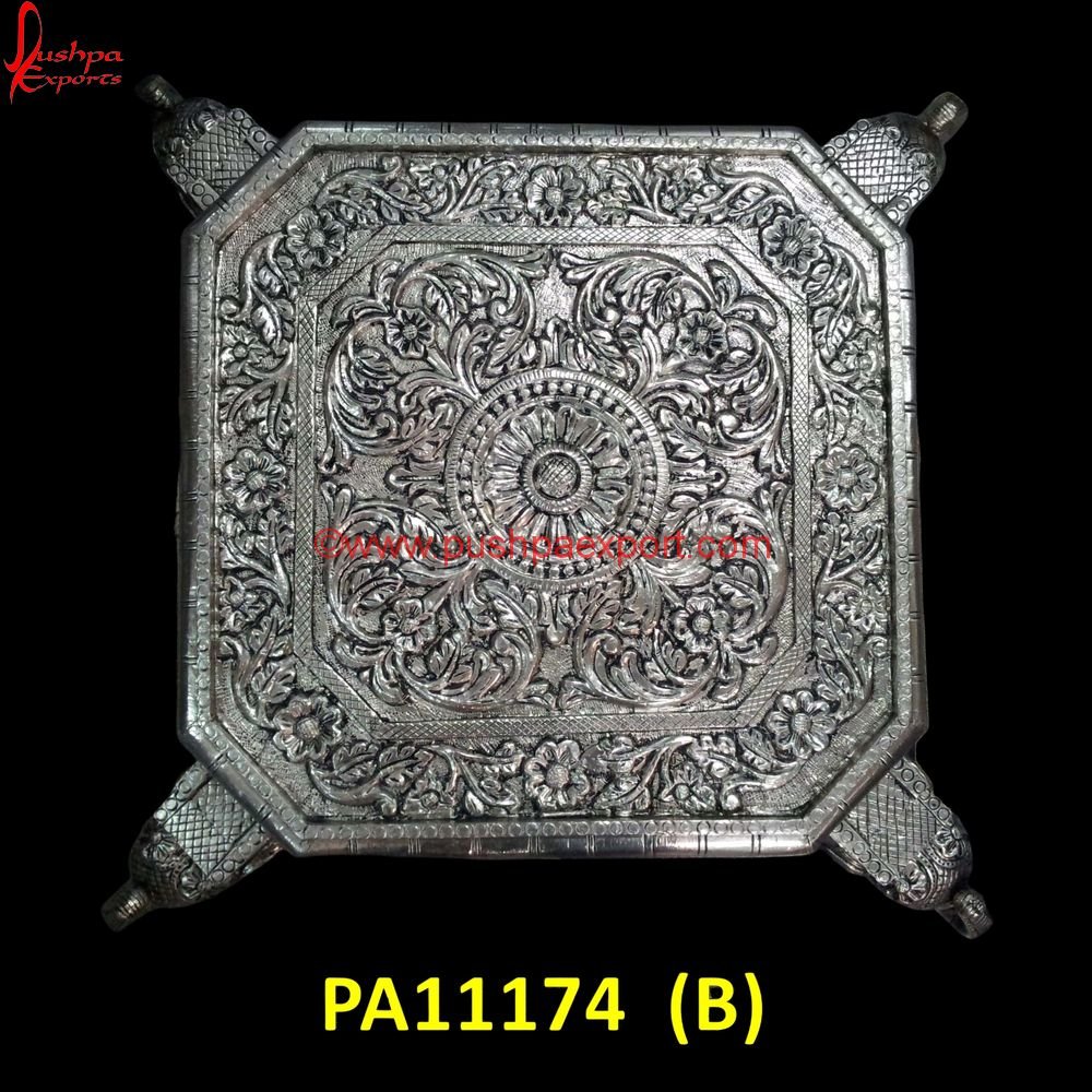 • The wooden frame of the white metal chowki is plated with an alloy of nickel, zinc, and copper.