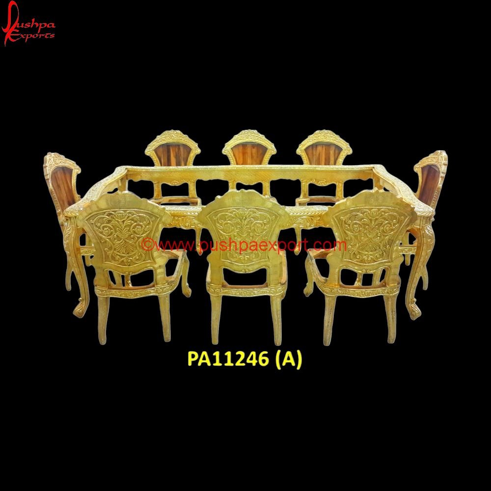 The set of white metal dining table and white metal dining chairs features a decidedly royal aesthetic, courtesy of the antique finish given to it post indenting the white metal sheet into the edges of the carvings. The upholstery of the silver dining table chairs is usually made out of velvet but it can be customized in the fabric of your choice. With intricately carved legs and edges of the frame of the white metal table, you can easily distinguish our white metal handicraft furniture having charisma and panache. The hand-carved dining table provides your dining room with an overpowering beautiful sheen that lights up the entire room due to the coating of white metal sheet. The silvery shine of the white metal dining table and chairs is arresting, and the floral carving design only adds to that quality. The floral design of the silver leaf dining table is not only ornate and bright with its rolling leaves and flowers, but also the construction of the white metal diningitself is unique.