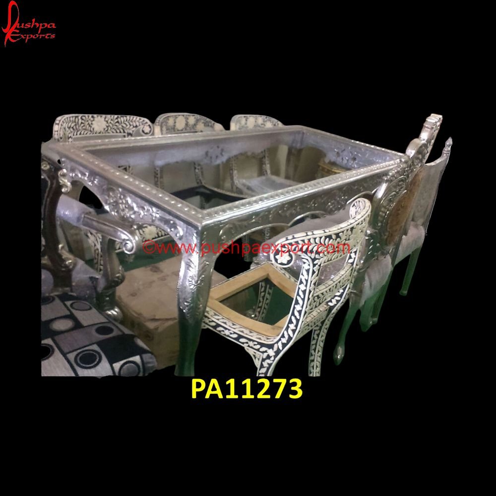 We, at Pushpa Exports, aim to inspire beautiful living through a sophisticated and durable range of antique silver dining sets. We use only the supreme quality materials to bring intelligent, elegant, and functional designs to help you craft your spaces just the way you want. What could be more important than the one space in your home that strengthens and nourishes familial bonds over food? Yes, it is the white metal dining table set The silver dining room furniture offers you a beautifully carved teak dining tabletop combined with luxuriously upholstered carving dining chairs. Our regal silver dining table makes you travel back in time and improves the look and feel of your home.
