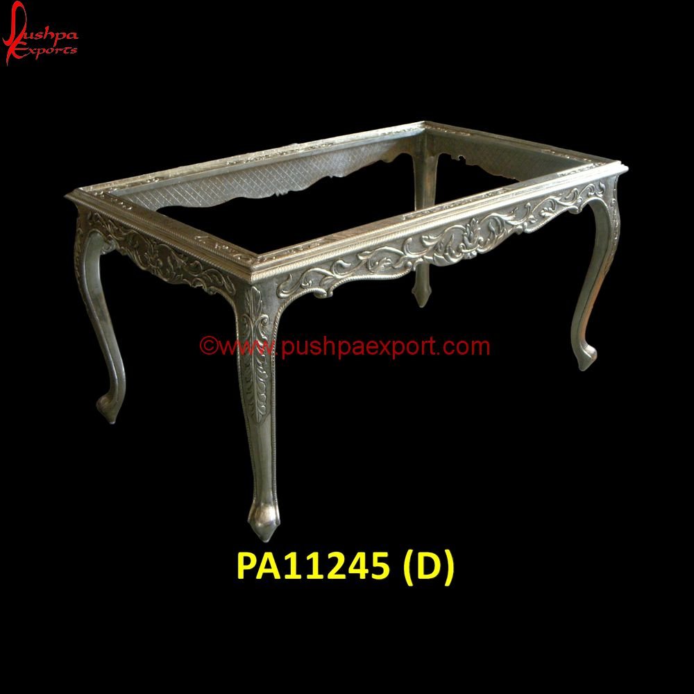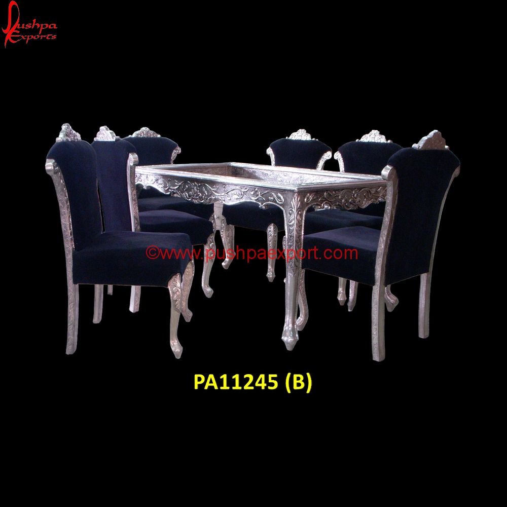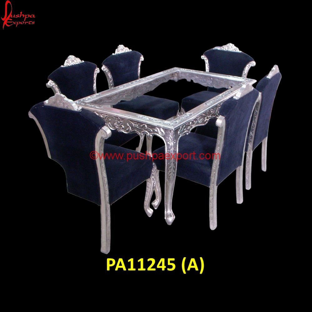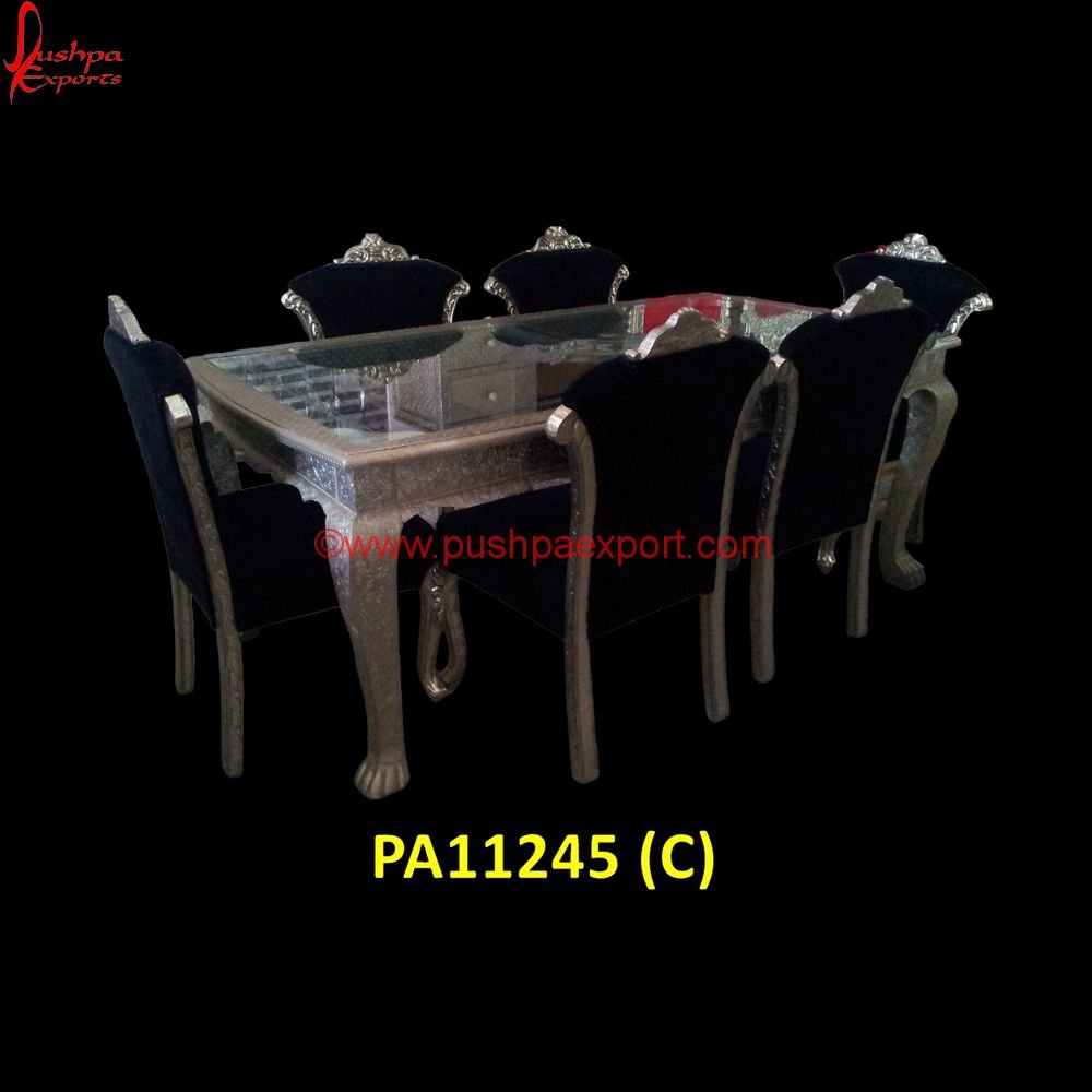 We, at Pushpa Exports, aim to inspire beautiful living through a sophisticated and durable range of antique silver dining sets. We use only the supreme quality materials to bring intelligent, elegant, and functional designs to help you craft your spaces just the way you want. What could be more important than the one space in your home that strengthens and nourishes familial bonds over food? Yes, it is the white metal dining table set The silver dining room furniture offers you a beautifully carved teak dining tabletop combined with luxuriously upholstered carving dining chairs. Our regal silver dining table makes you travel back in time and improves the look and feel of your home.