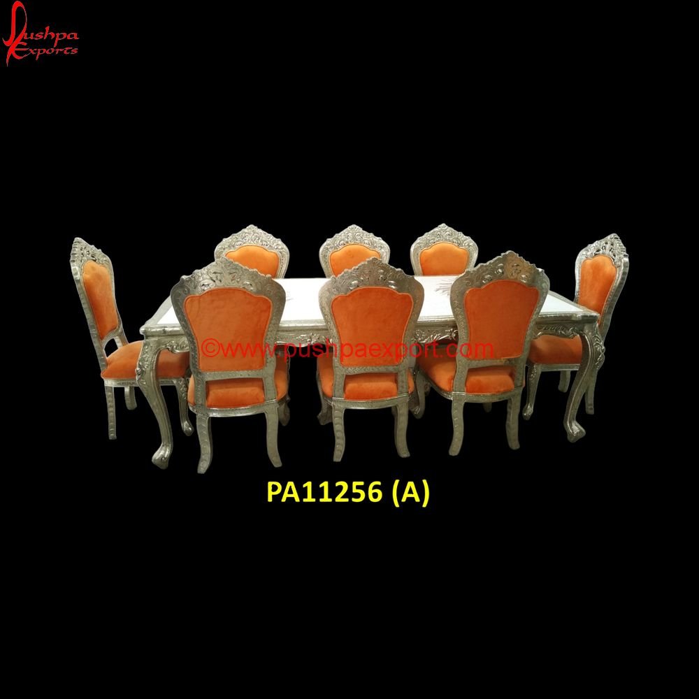We, at Pushpa Exports, aim to inspire beautiful living through a sophisticated and durable range of antique silver dining sets. We use only the supreme quality materials to bring intelligent, elegant, and functional designs to help you craft your spaces just the way you want. What could be more important than the one space in your home that strengthens and nourishes familial bonds over food? Yes, it is the white metal dining table set The silver dining room furniture offers you a beautifully carved teak dining tabletop combined with luxuriously upholstered carving dining chairs. Our regal silver dining table makes you travel back in time and improves the look and feel of your home.