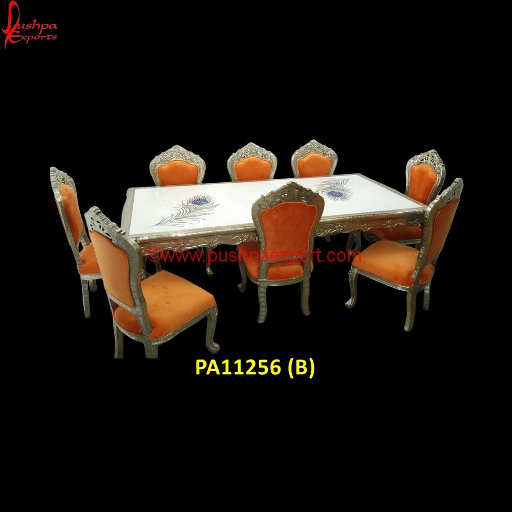 The White Metal Dining Table with Peacock Feather Embossing is of supreme-quality Teak wood. The White Metal Dining Table with Peacock Feather Embossing is plated with an alloy of nickel, zinc, and copper. Though it has been coated with PU/lacquer to make its shine last for years, if need be, the White Metal Dining Table with Peacock Feather Embossing can be polished. The White Metal Dining Table with Peacock Feather Embossing is fully hand-carved from start to finish. Therefore, each piece possesses some uniqueness. Anything from the size to the design of the White Metal Dining Table with Peacock Feather Embossing is customizable. The materials of the White Metal Dining Table with Peacock Feather Embossing can be altered as per the customers’ requirements. The White Metal Dining Table with Peacock Feather Embossing can also be plated with silver sheet, brass sheet, bronze sheet, or copper sheet, or it can simply be polished wood according to the customers’ choice. The White Metal Dining Table with Peacock Feather Embossing are upholstered with high quality foam sheets and fabrics such as velvet, corduroy, and raw silk, depending on the customers’ desire. Our White Metal Dining Table with Peacock Feather Embossing will find a place anywhere be it your home, hotel, fine dining restaurant, etc.