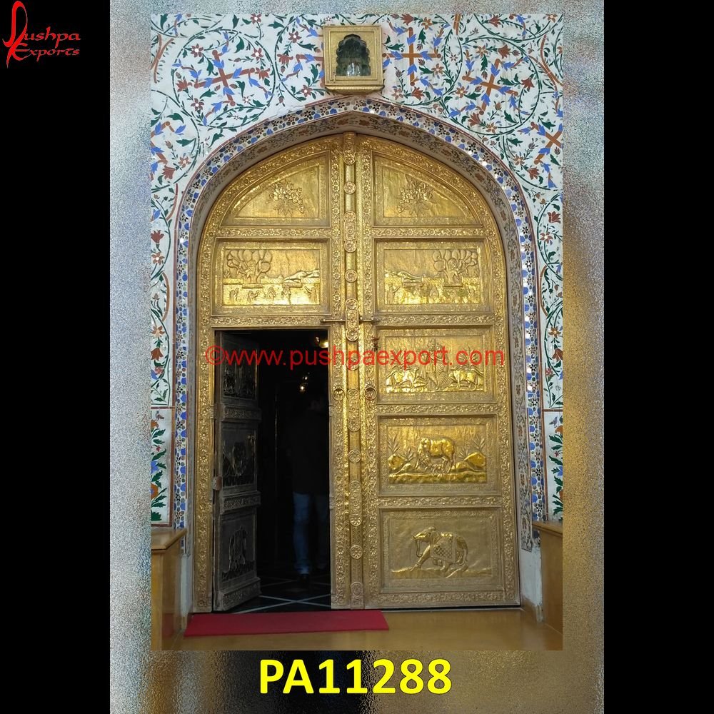 • The Radha Krishna Brass Door with white metal sheet coating appears luxurious.