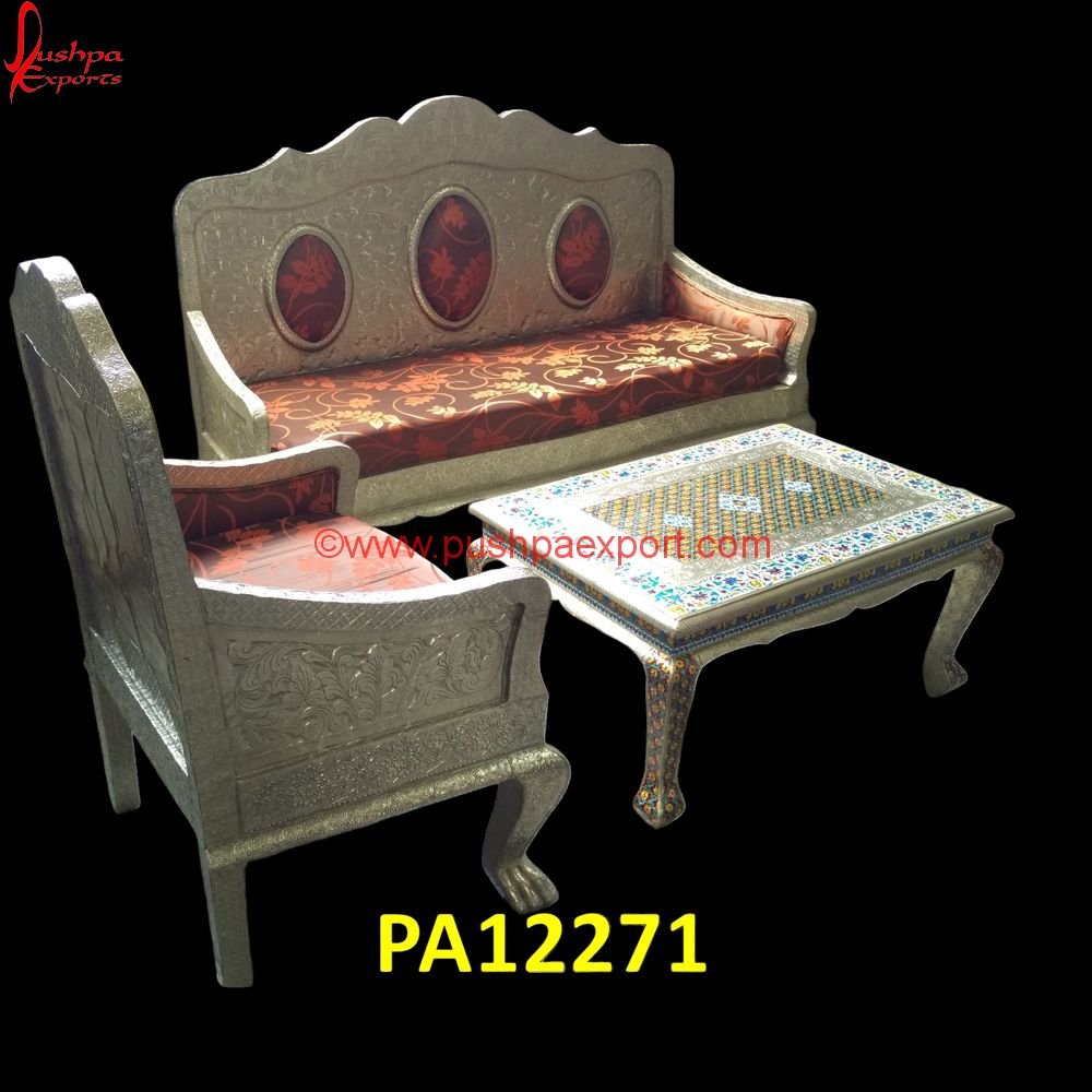 Explore the full range of best white metal furniture in Udaipur brought to you by Pushpa Exports. From our luxurious collection of silver living room furniture, the elaborately hand-carved wooden sofa set is coated with white metal sheet and gives a vintage look to your drawing room. Our Victorian carved sofa is an exclusive feature rich product fully handcrafted by our highly skilled artisans.