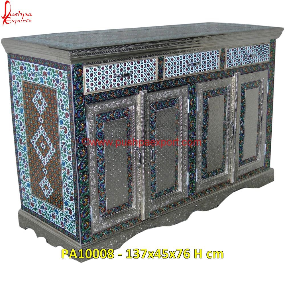 The Antique Silver Closet in Meenakari is made of premium-quality Teak wood. The wooden frame of the Antique Silver Closet in Meenakari is plated with white metal sheet which is an alloy of nickel, zinc, and copper. The Antique Silver Closet in Meenakari will make your room look exclusive. Though it has been coated with PU/lacquer to make its shine last for years, if need be, the Antique Silver Closet in Meenakari can be polished. German silver or white metal does not tarnish. The Antique Silver Closet in Meenakari is fully hand-carved from start to finish. Therefore, each piece possesses some uniqueness. Anything from the size to the design of the Antique Silver Closet in Meenakari is customizable. The raw materials of the Antique Silver Closet in Meenakari can be altered as per the customers’ requirements. The Antique Silver Closet in Meenakari can also be plated with silver, brass, bronze, or copper sheet, or it can simply be polished according to the customers’ choice. Our Antique Silver Closet in Meenakari can be used in homes, hotels, and many other places as well.